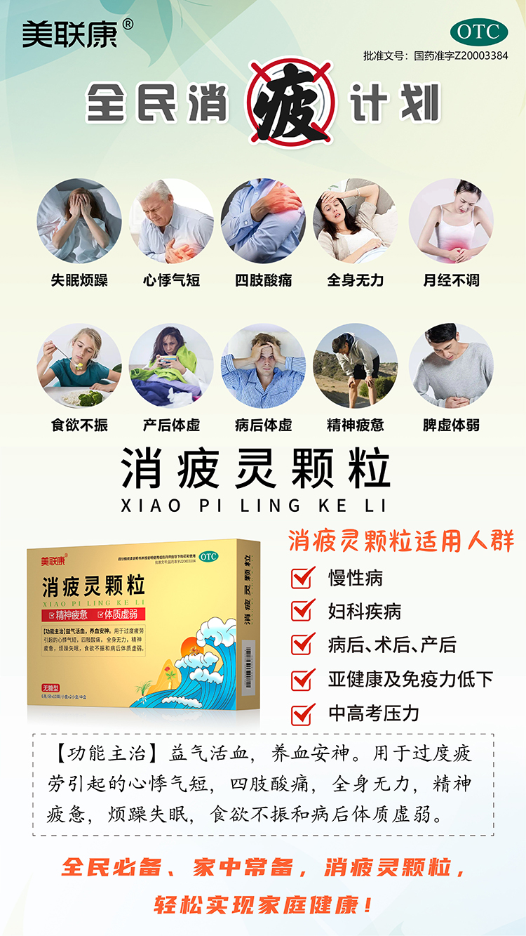 答消疲靈顆粒有益氣養血,活血安神的功效,由14味名貴中藥組合而成,主要是用于過度疲勞所引起的相關癥狀,可以改善患者心悸氣短、四肢酸痛、全身無力、精神疲憊、煩躁失眠、食欲不振等多個癥…