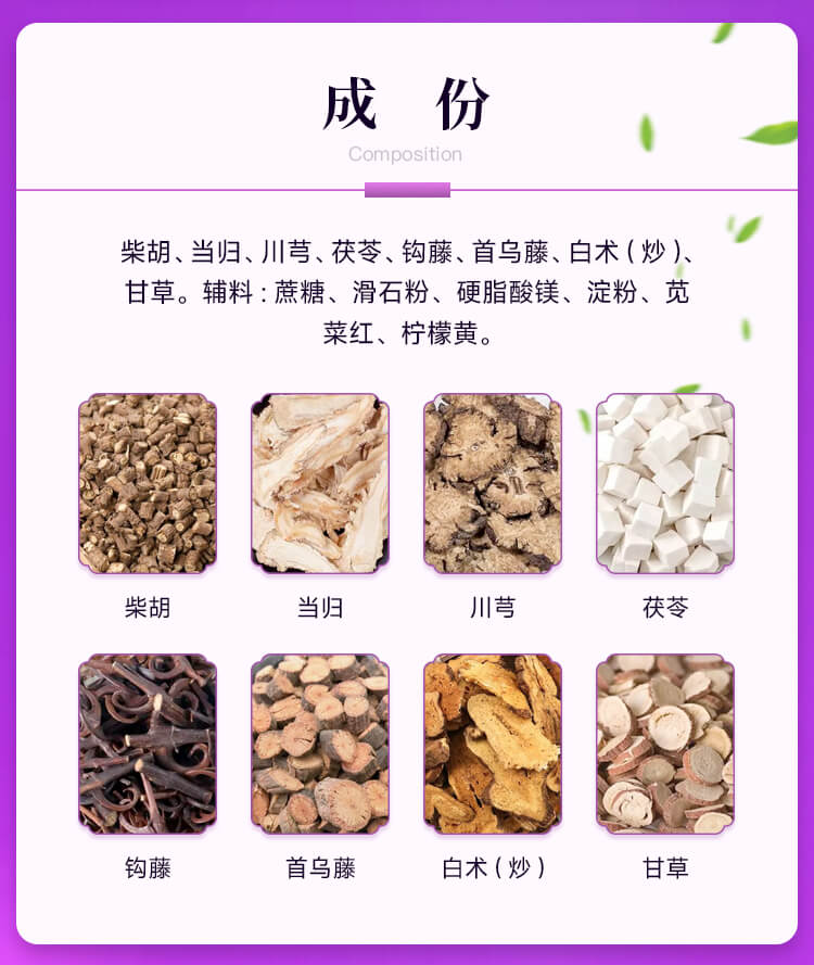 【主要成份】柴胡、當歸、川芎、茯苓、鉤藤、首烏藤、白術(炒)、甘草。