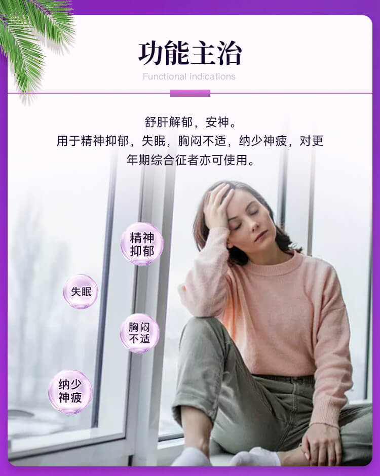 【功能主治/適應癥】舒肝解郁,安神。用于精神抑郁,失眠,胸悶不適,納少神疲,對更年期綜合征者亦可使用。