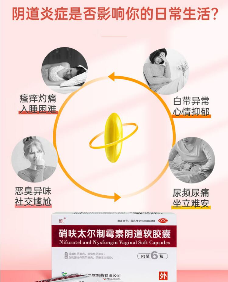【注意事項】 1.本品僅供陰道給藥,切忌口服。 2.為獲得較好療效,盡量將本品置入陰道深處。 3.連續使用本品1~2療程后,如癥狀未緩解或消失,應咨詢醫師。 4.孕婦應在醫師指導下使用,哺乳期婦女慎用。 5.無性生活史的女性應在醫師指導下使用。 6.使用本品期間勿飲用含酒精的飲料,酒精會引起不適或惡心,但這種反應會自行消失。 7.給藥時應洗凈雙手或戴指套或手套。 8.用藥期間注意個人衛生,防止重復感染,避免房事。 9.用藥部位如有燒灼感、紅腫等情況應停藥,并將局部藥物洗凈,必要時向醫師咨詢。 10.使用本品時應避開月經期。 11.對本品過敏者禁用,過敏體質者慎用。 12.本品性狀發生改變時禁止使用。 13.請將本品放在兒童不能接觸的地方。 14.如正在使用其他藥品,使用本品前請咨詢醫師或藥師。