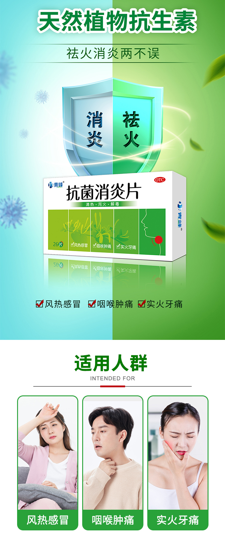 1、風(fēng)熱感冒/咽喉腫痛:抗菌消炎片+咽炎片